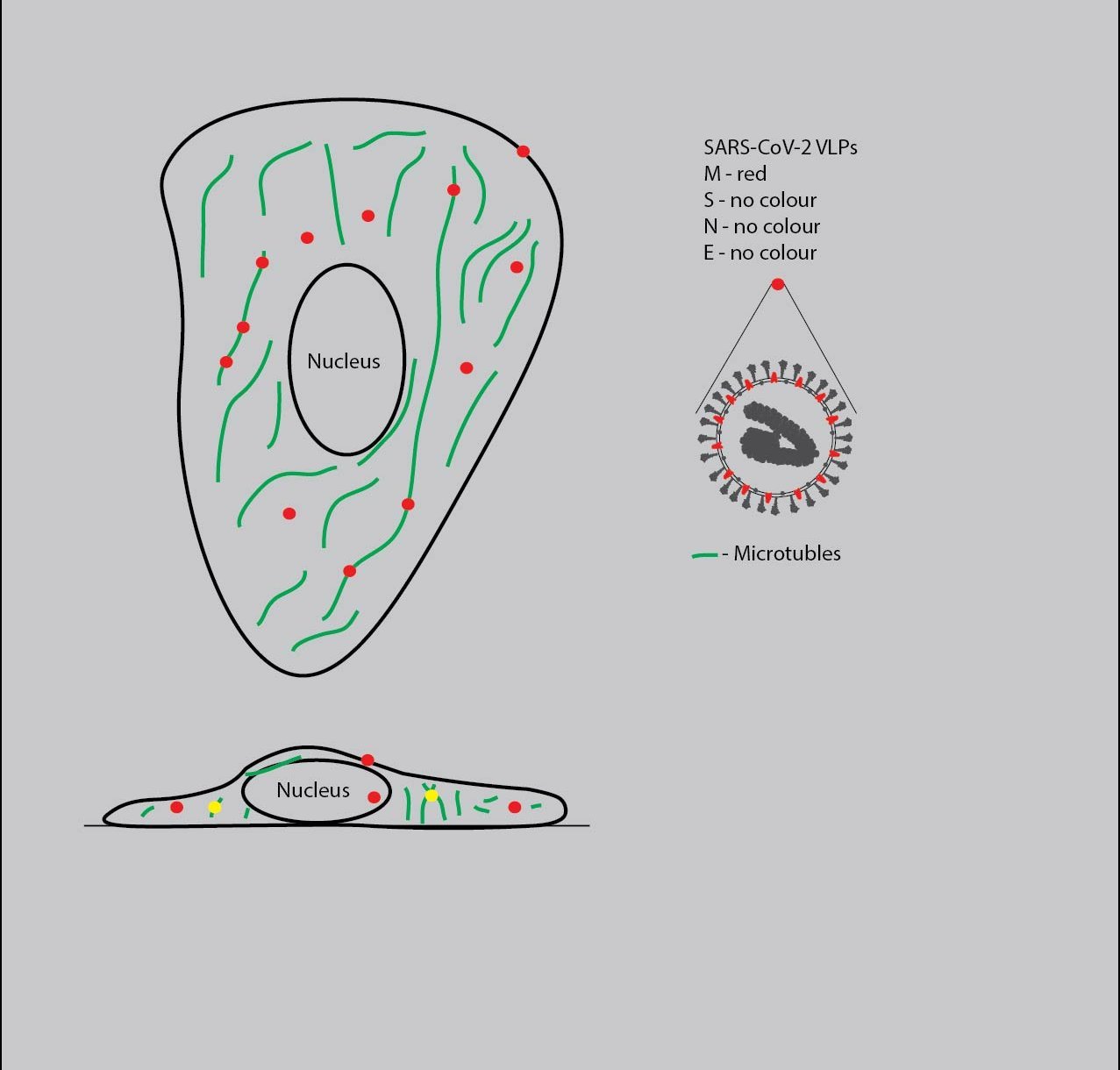 M-mCherry, Part of the M protein of the particle is tagged with mCherry. This allows us to track the membrane of the particle under the microscope.