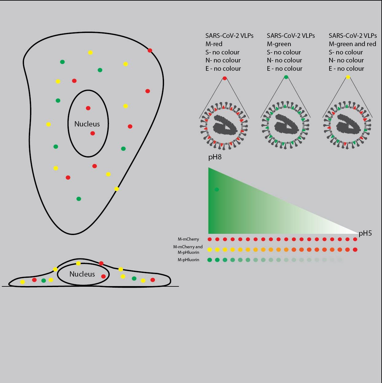 M-mCherry M-pHluorin, Part of the M protein of the particle is tagged with mCherry and part with M-pHluorin. This allows us to track simultaneously the membrane of the particle and the the change of the pH under the microscope.
